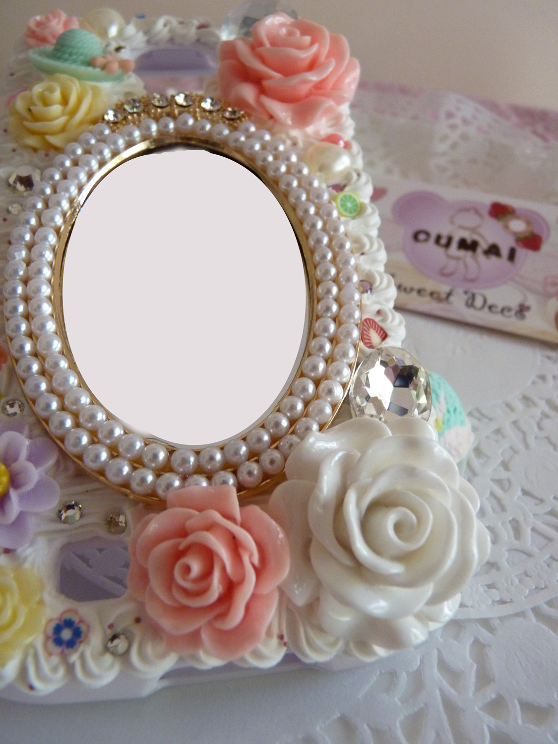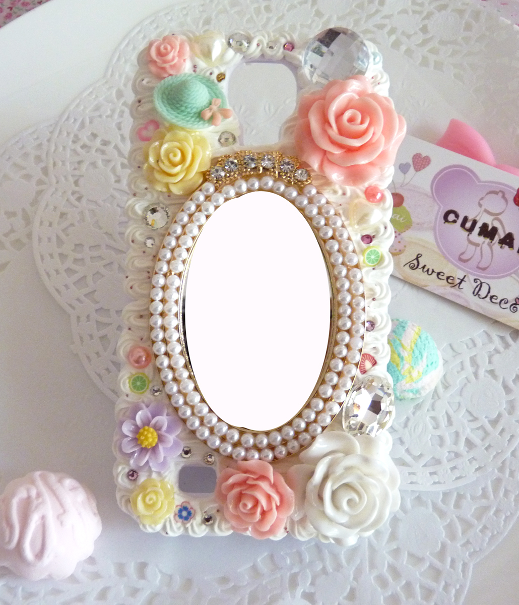 This is a beautiful, elegant mirror & flower whipped decoden case.